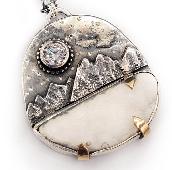 "Photos and words can really not do this piece justice. It has a personality all its own. Unique, vocal, sweet, hypnotic and cryptic. It tells stories with how it was crafted. Super quick shipping & lovingly packaged with notes about the piece! I received my necklace in record time. USPS normally doesn't operate that fast even in and around the OP...but it did this time. Thank you for everything! I love it truly."