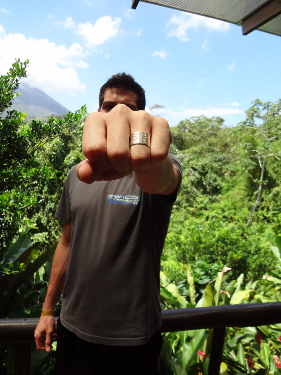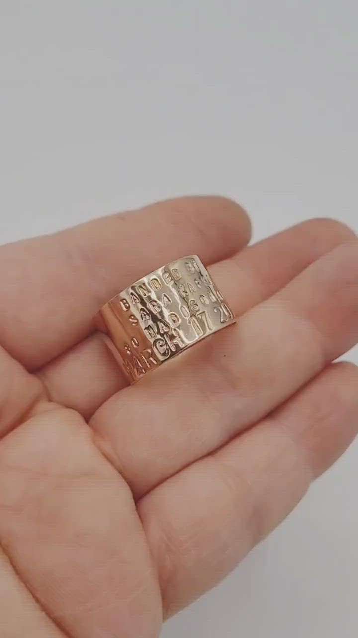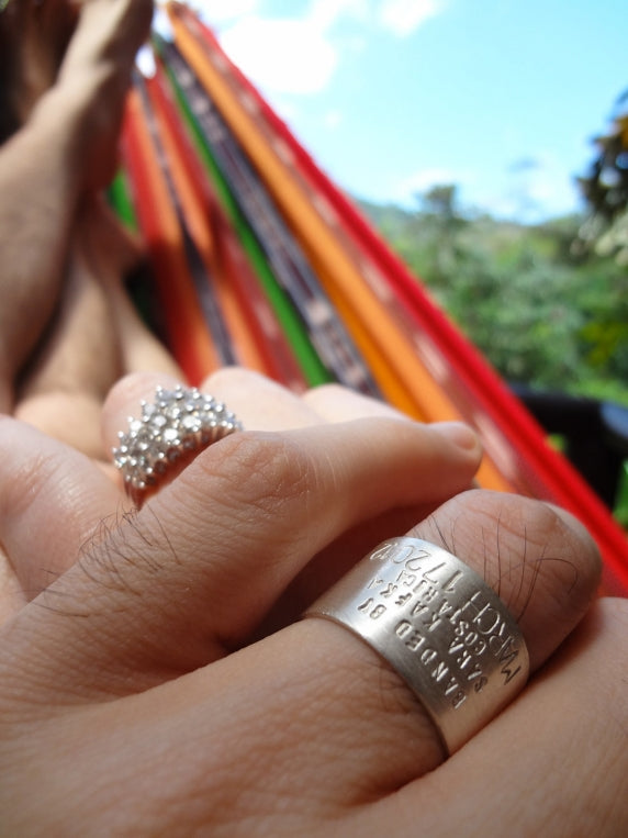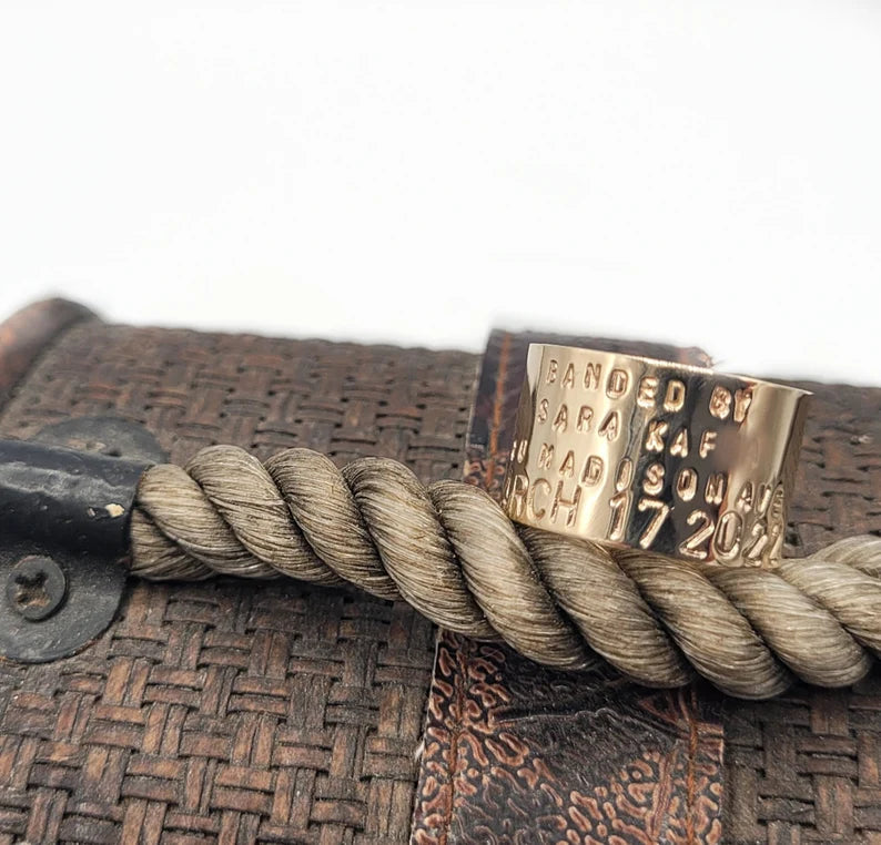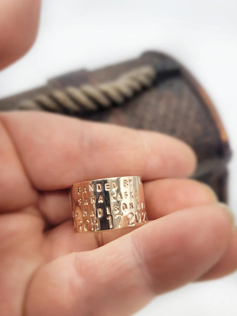 This ring was designed after bird bands that are used to keep track of individual birds, scientists put aluminum or colored bands on bird's legs. Similar to a license plate on a car, each band engraved with a unique set of numbers sometimes along with the name of who banded them.