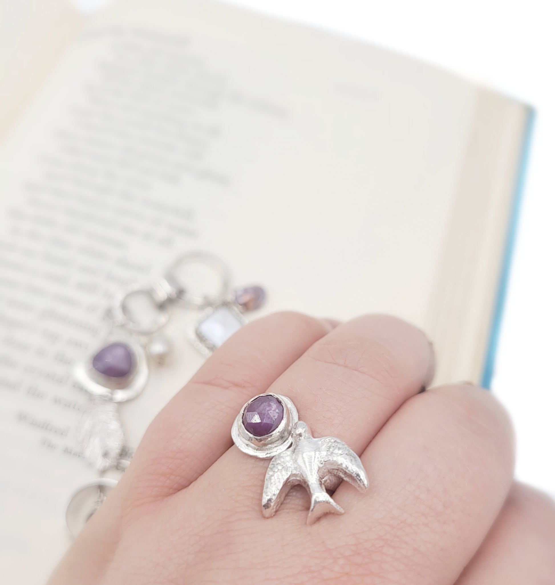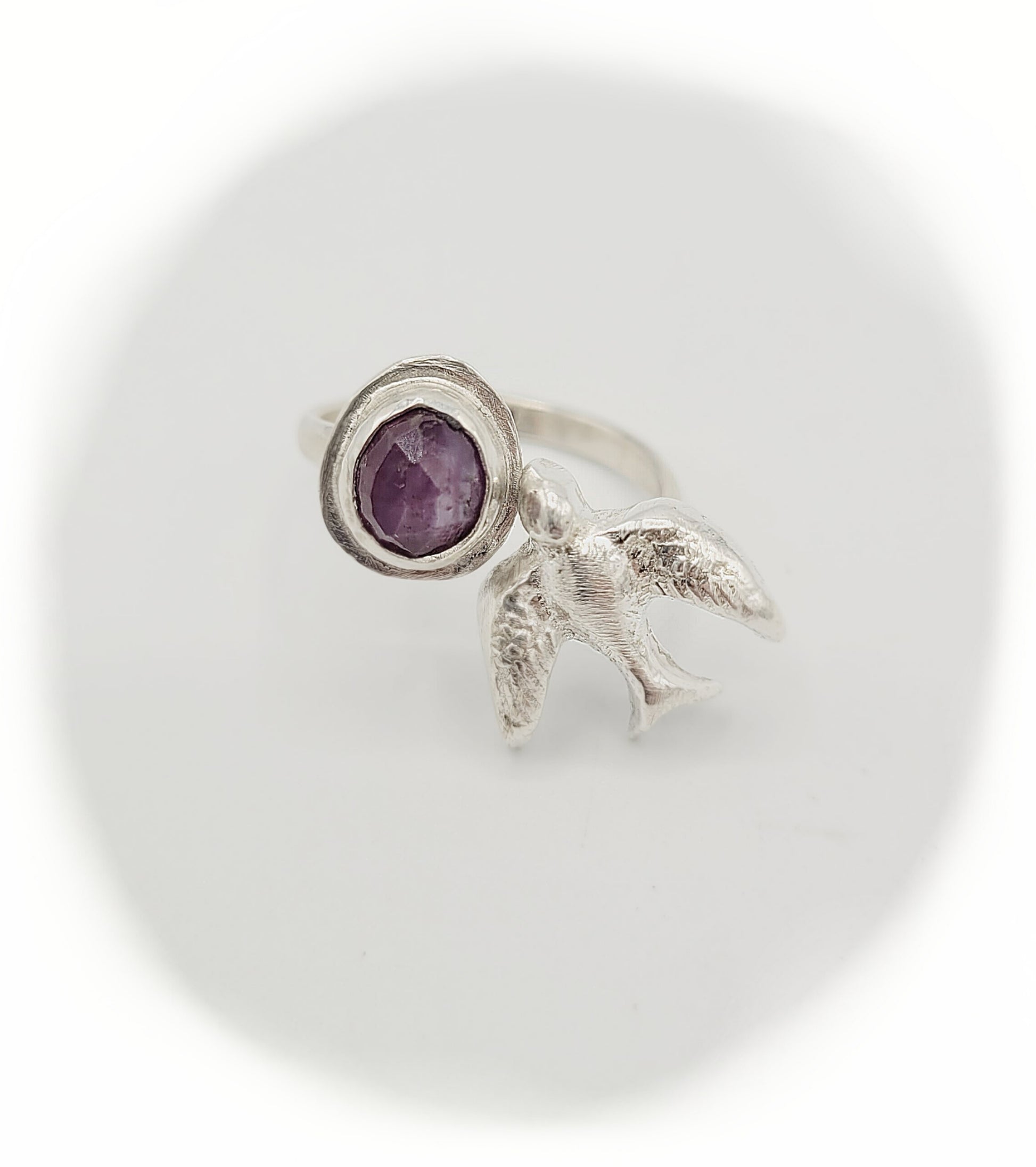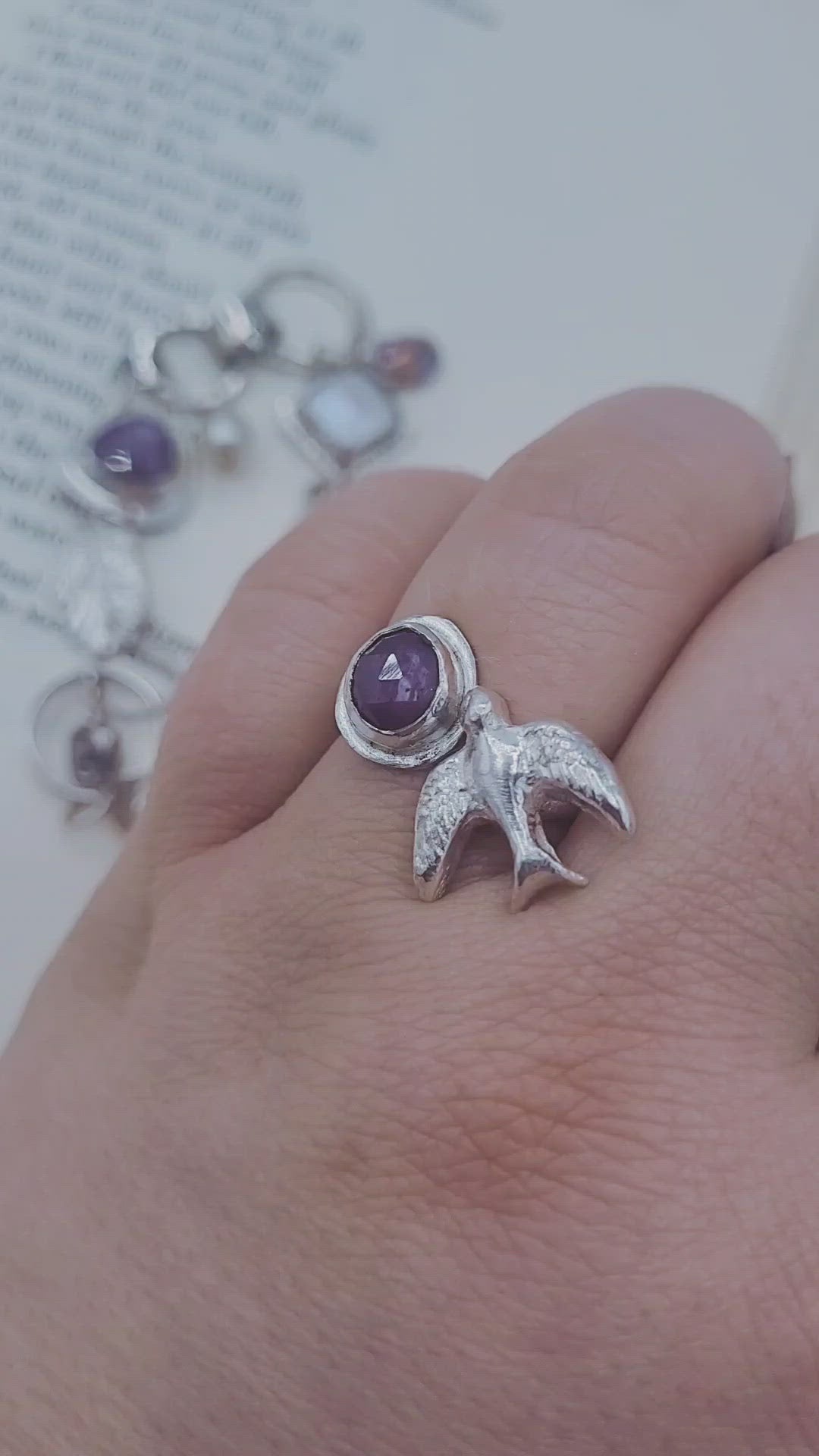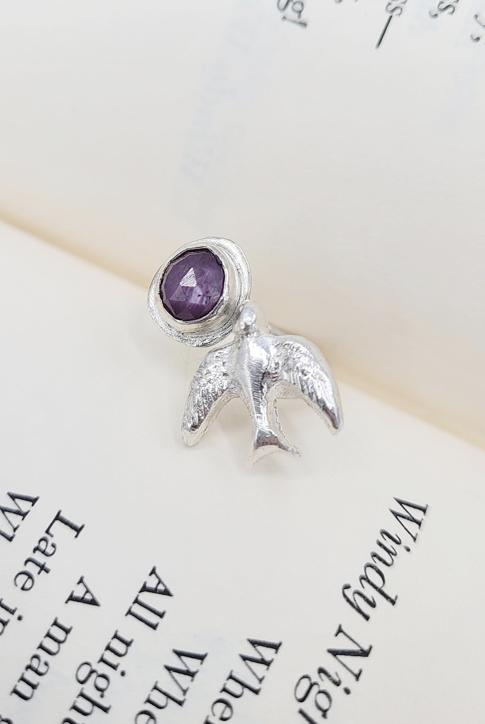 Hand molded fine silver bird with it's wings spread is nestled up against a shimmery rose cut pink sapphire that flashes colors of deep raspberry and greyish purple.