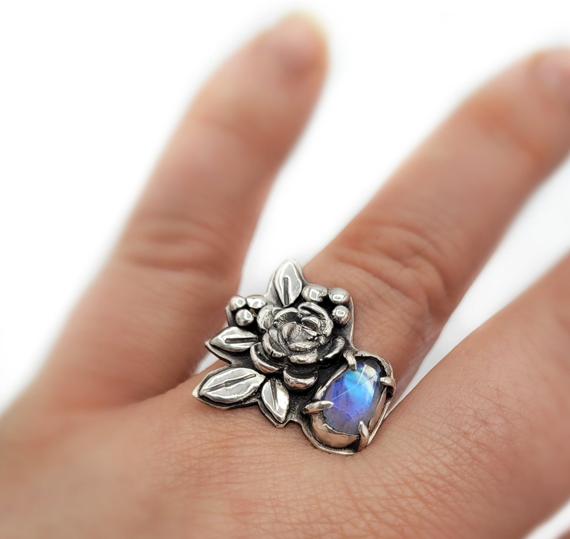 A beautiful faceted moonstone is nestled up against hand-cut leaves and berries surrounded by a lovely hand sculpted open silver blossom.
