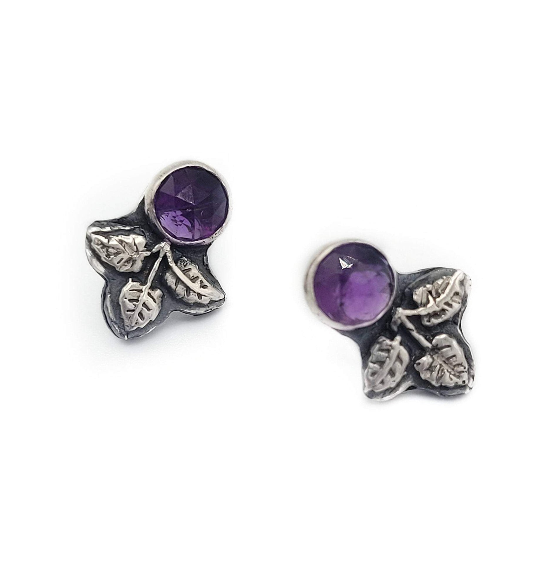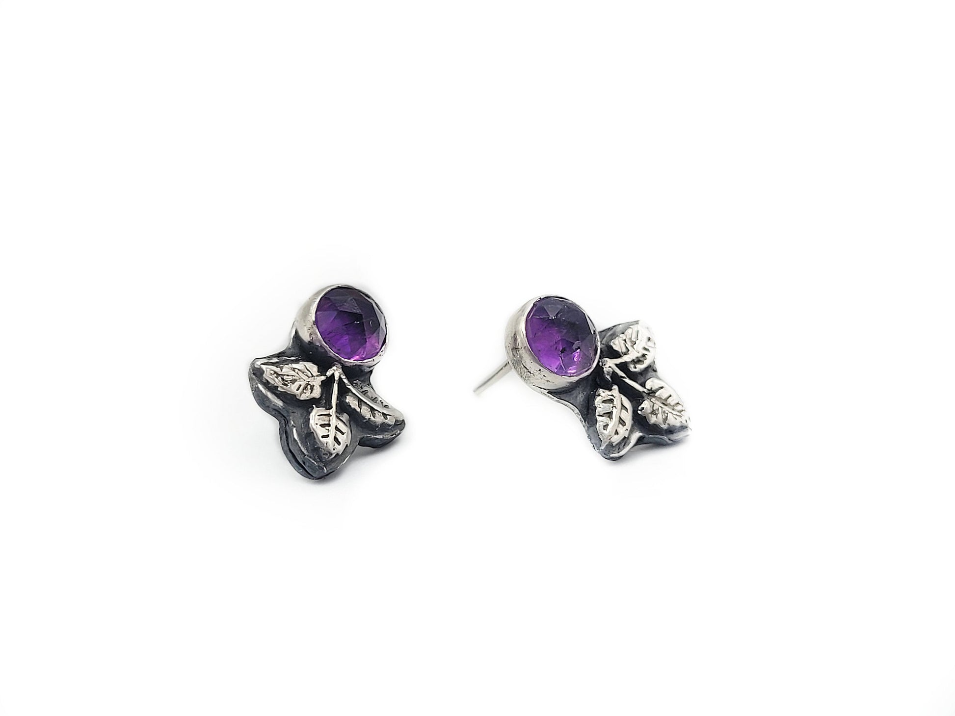 The leaves on these sweet feminine studs were handsculpted out of a metal clay called PMC. After the clay is fired it turns into pure fine silver. I oxidized the silver to add contrast and depth. The amethyst is an absolutely beautiful shade of purple that sparkles in the light.