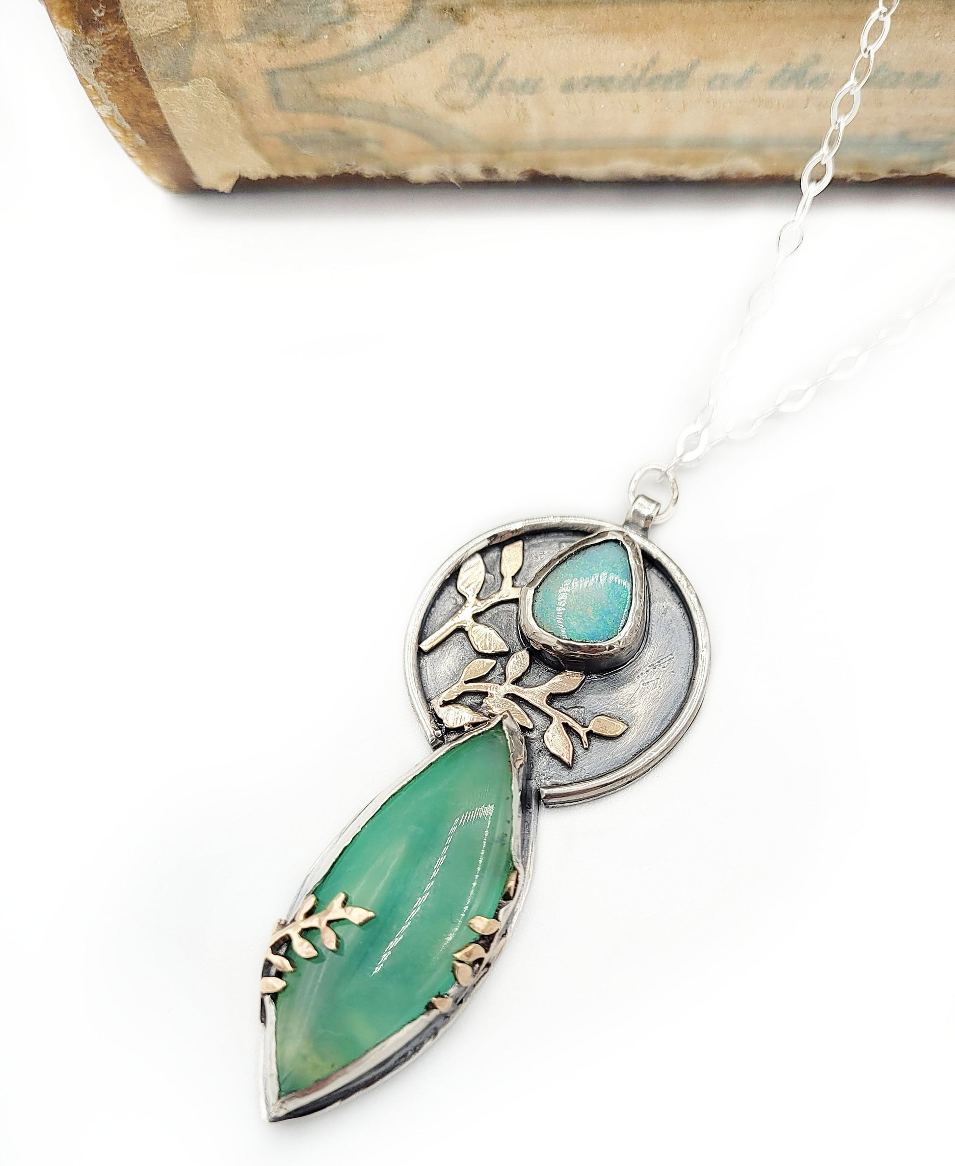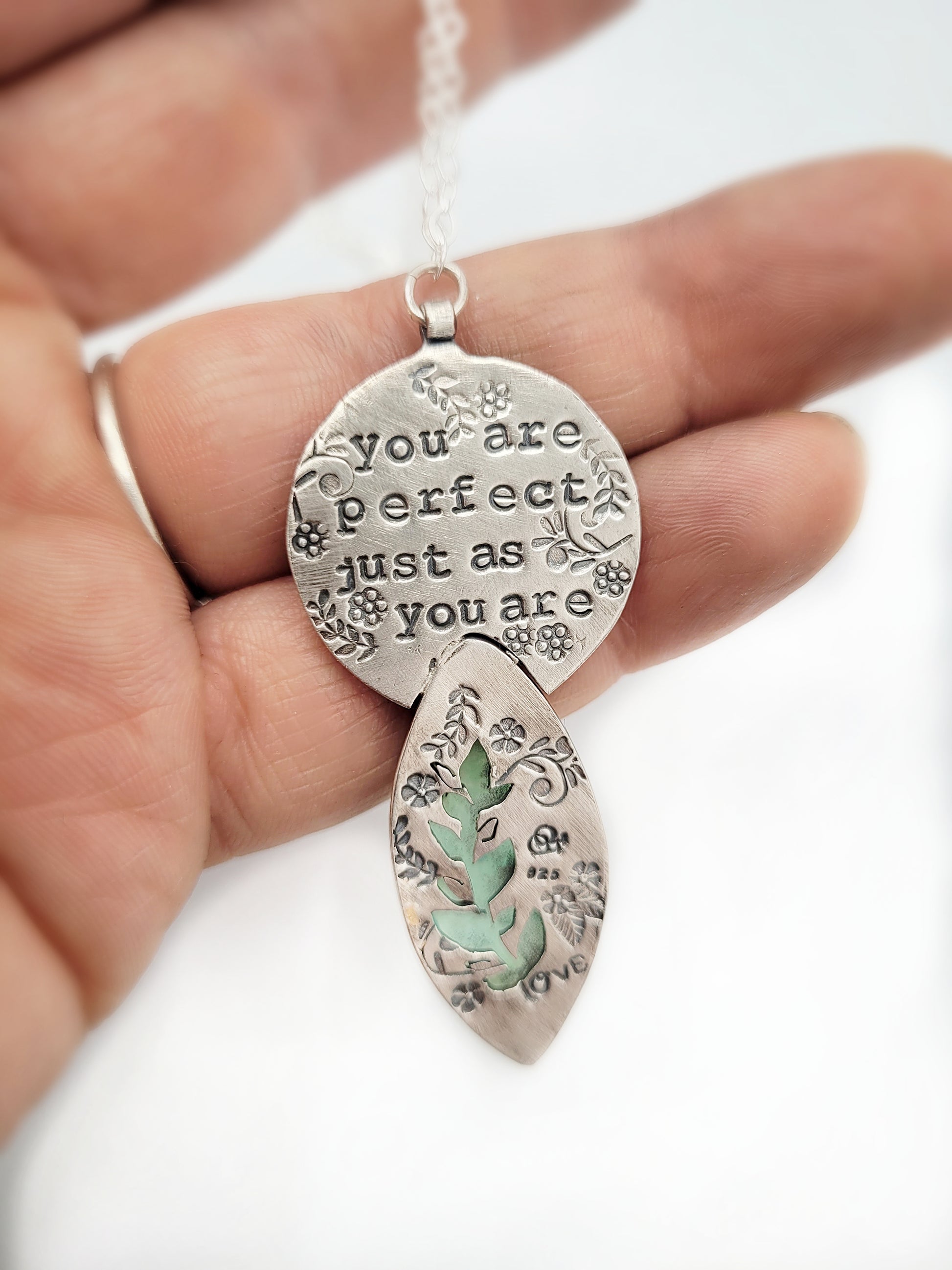 I wanted this piece to go perfectly as planned. I have been waiting so long for THE PERFECT design to use both of these beautiful stones. When things didn't go exactly as planned with the bezel I decided to just keep going with it because I remembered that sometimes imperfection is what I love most in jewelry. Imperfection is much more interesting than perfection in people too so on the back I stamped the words, "You are perfect just as you are. " Now that it's finished I am so glad I didn't start over and erase those sweet interesting imperfections!
