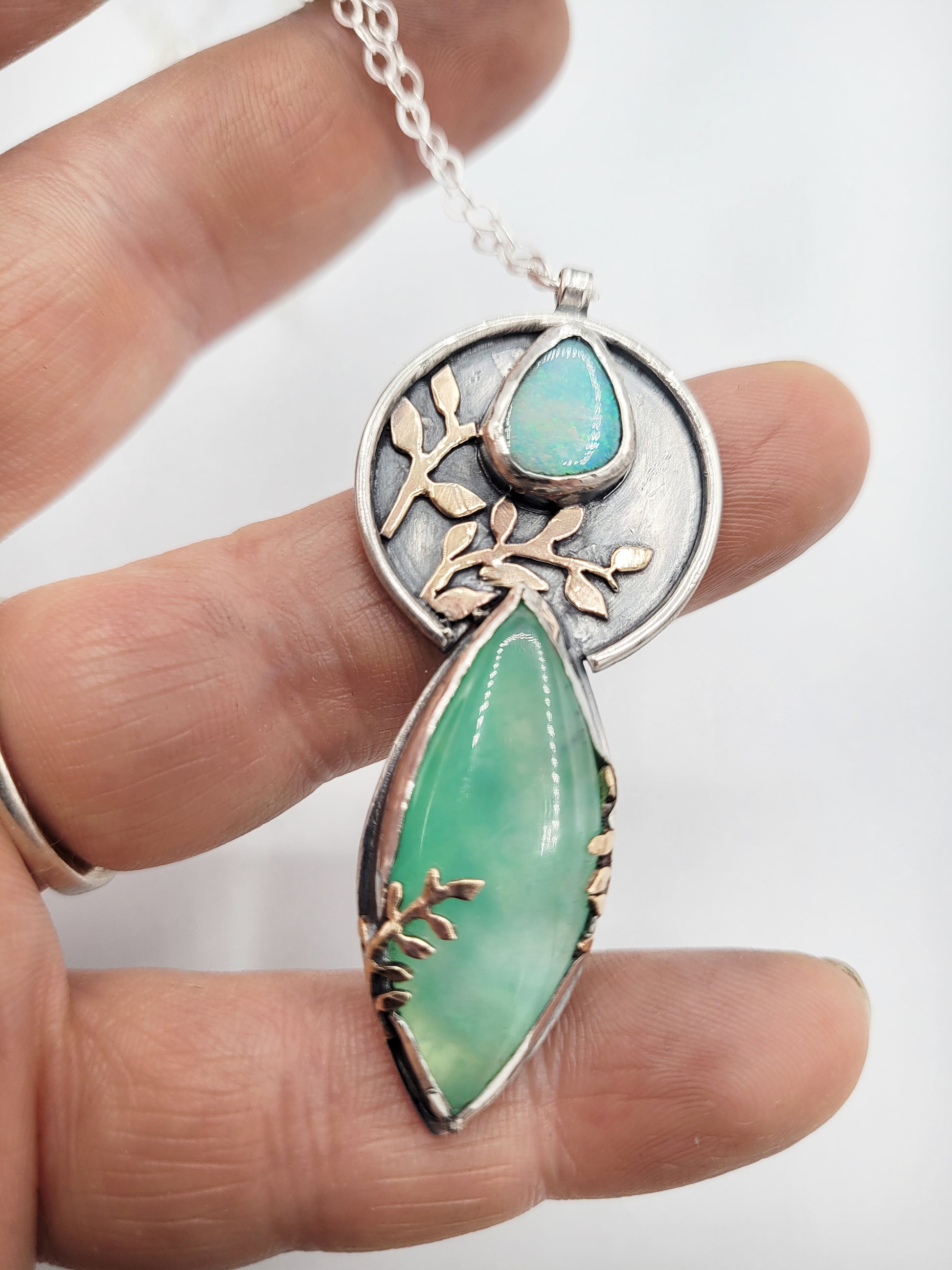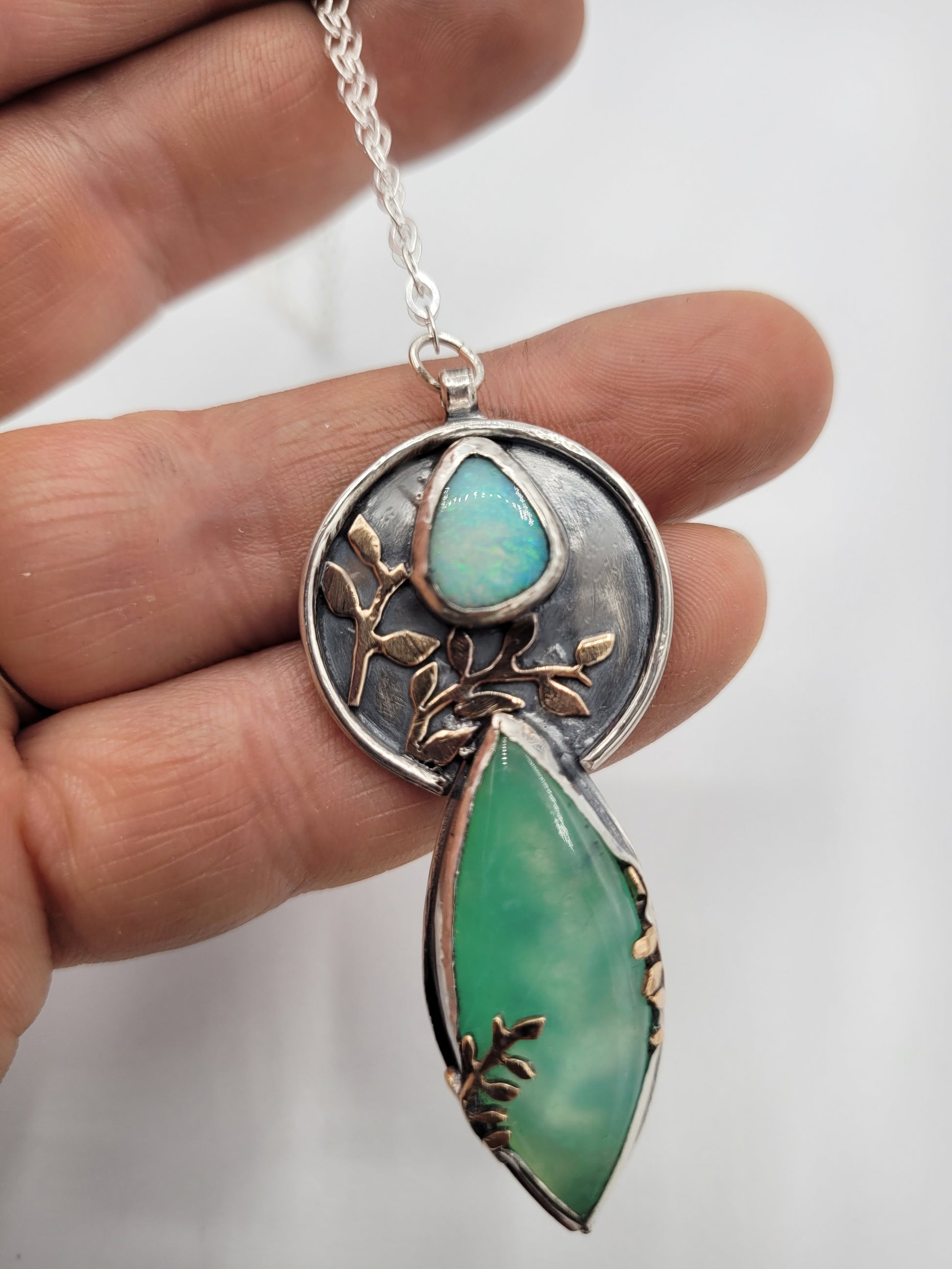 The lovely stone on the top is an Australian Opal Doublet and the glowy gorgeous stone on the bottom is Chalcedony.