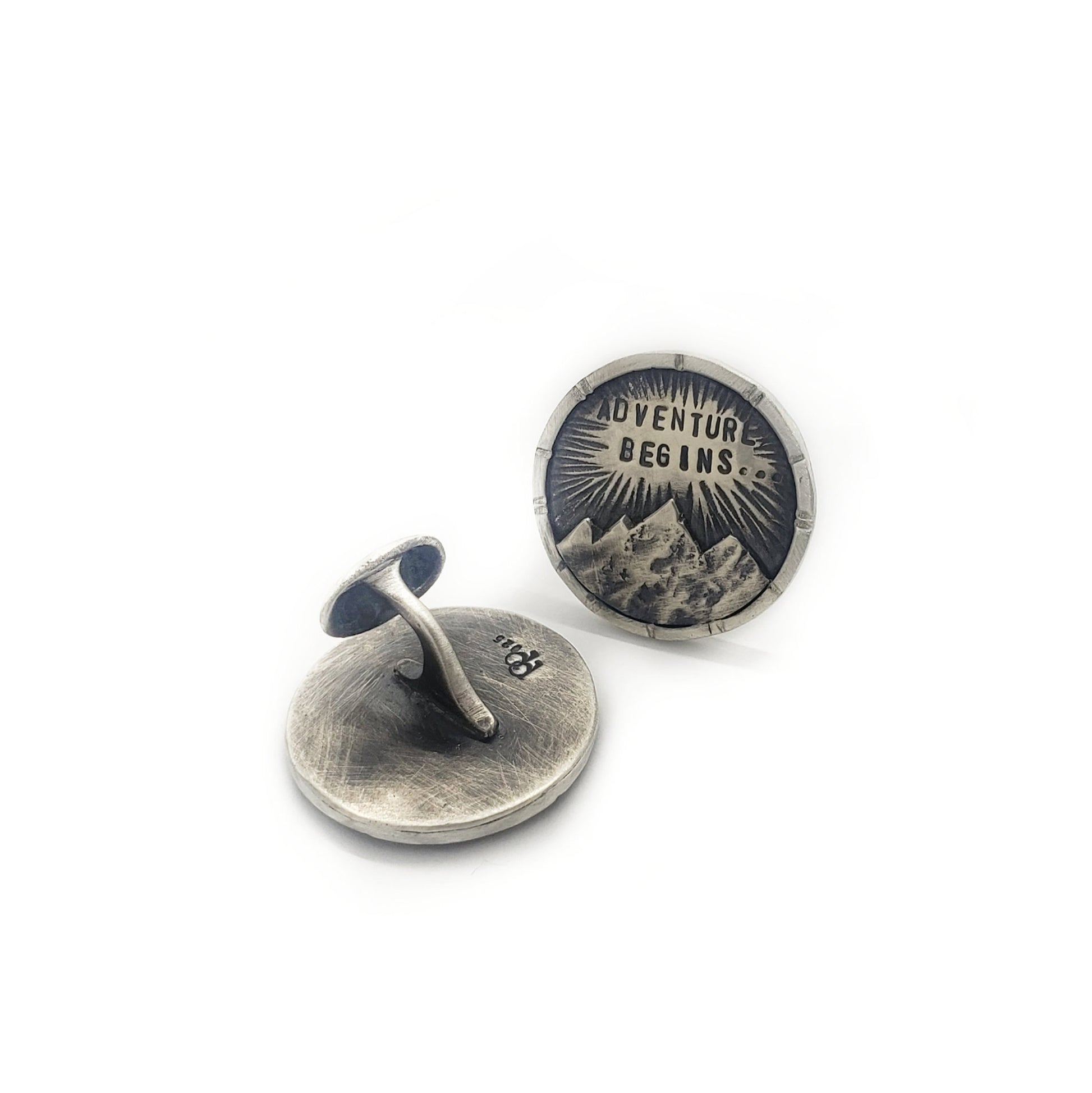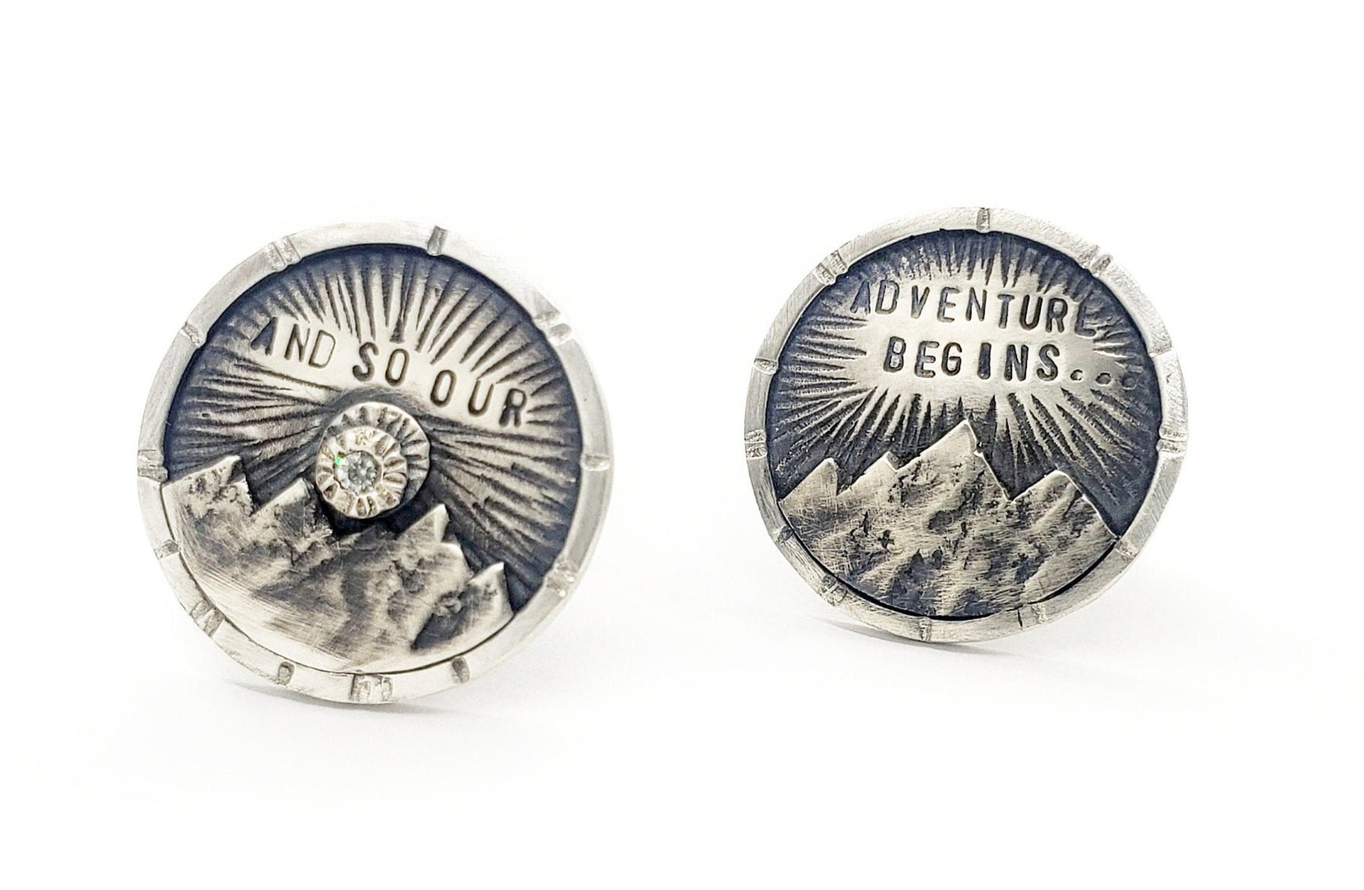 Inscribed with, "And so our adventure begins..." these are the perfect gift for a wedding or any other beginning. I hand cut, textured, soldered, oxidized, set a cubic zirconia sun and highlight finished these in my Seattle, WA metalsmith studio. 1 set is currently in stock and ready to ship.