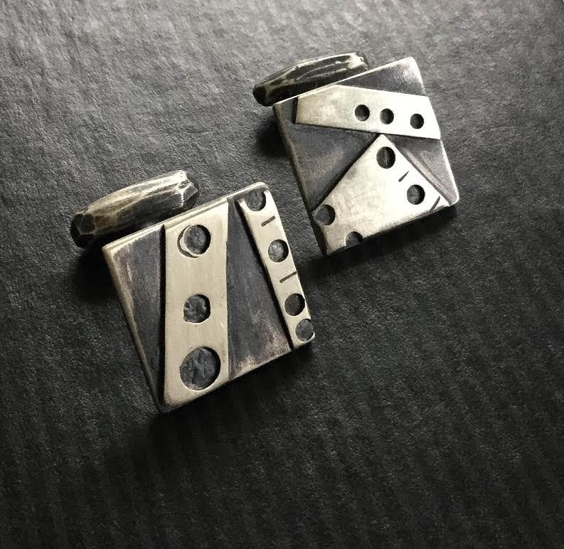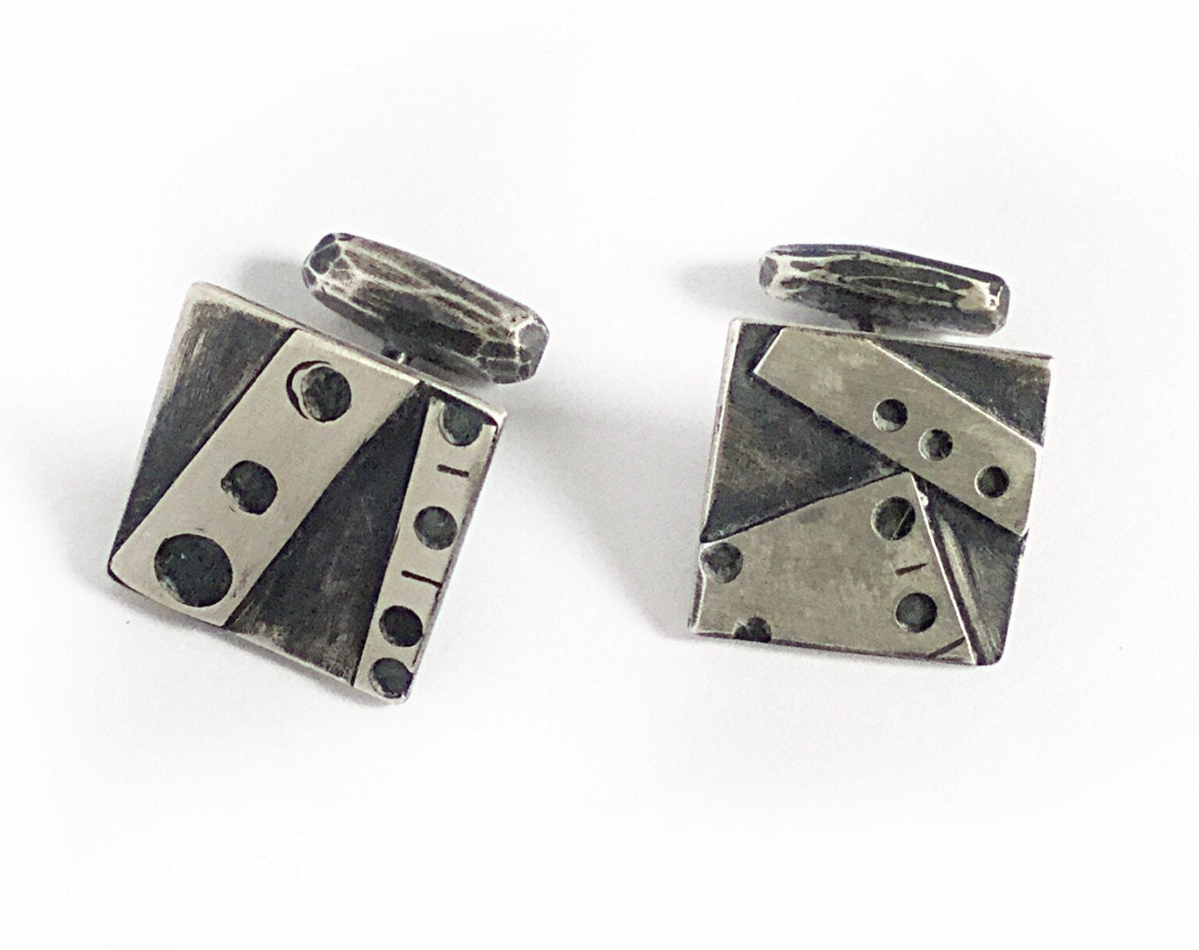 This is the first of what I plan to be a collection of similar designs, not one exactly like another. Notice each cuff link isn't identical either, they compliment each other! I gave them the name "Industrial Luck" because the contrast gives the abstract look of dice as well as having a rustic industrial feel to them. They were carefully made of pure sterling silver to be very durable. The contrast is created by oxidizing the sterling silver and then smoothing some of it off. You will love these even more in person, the photo doesn't do them justice!