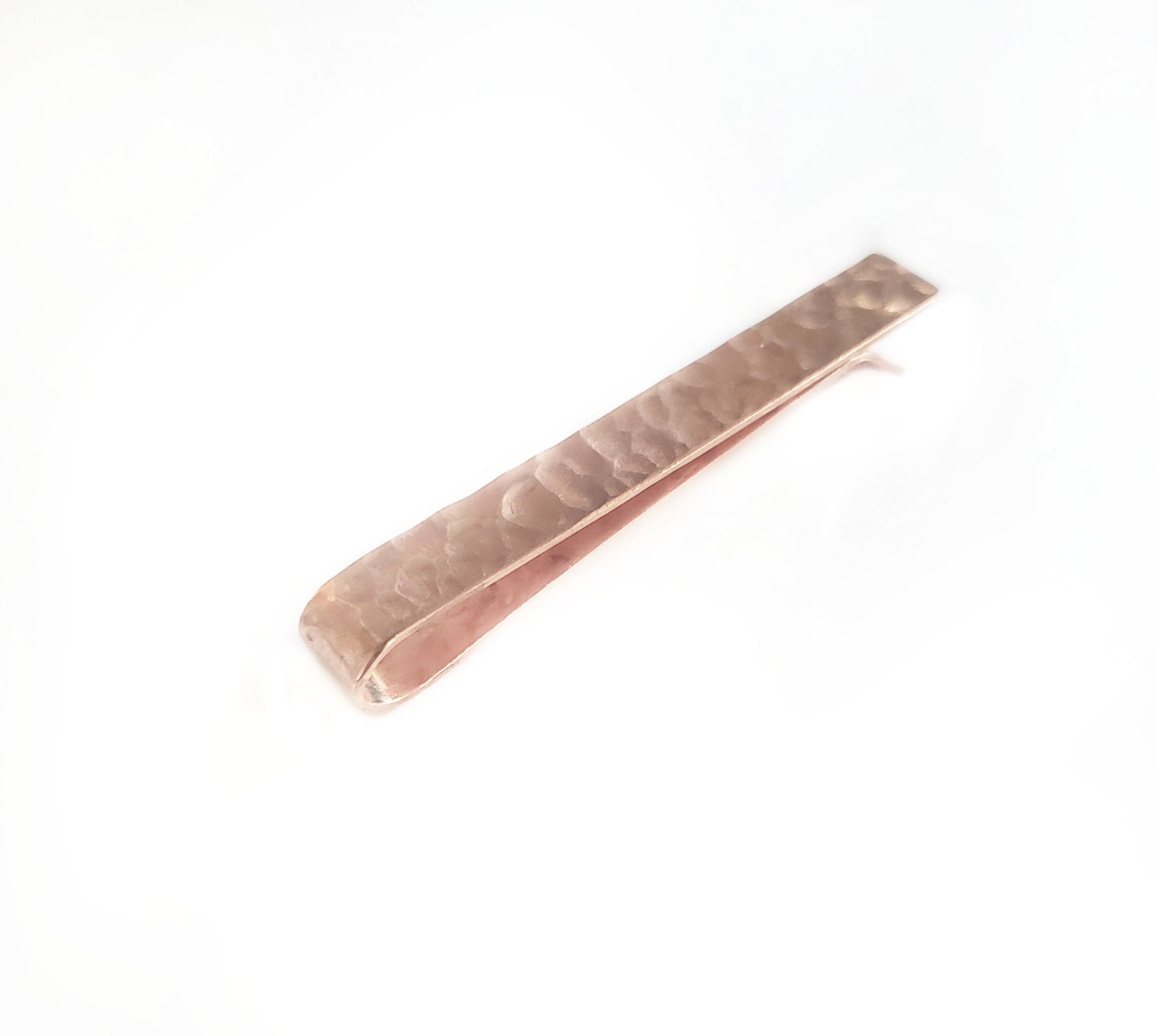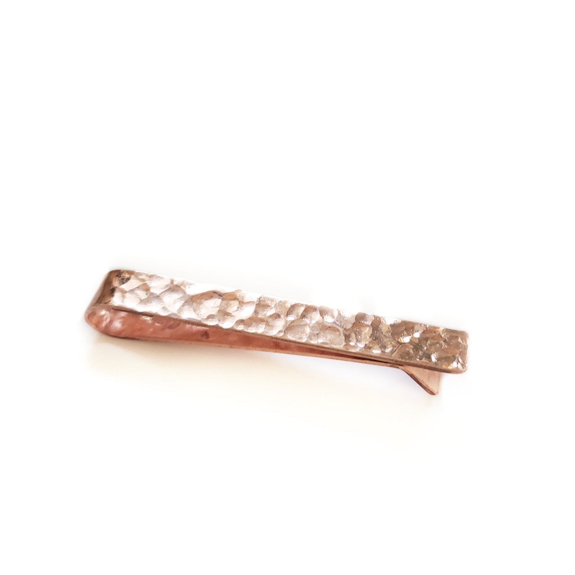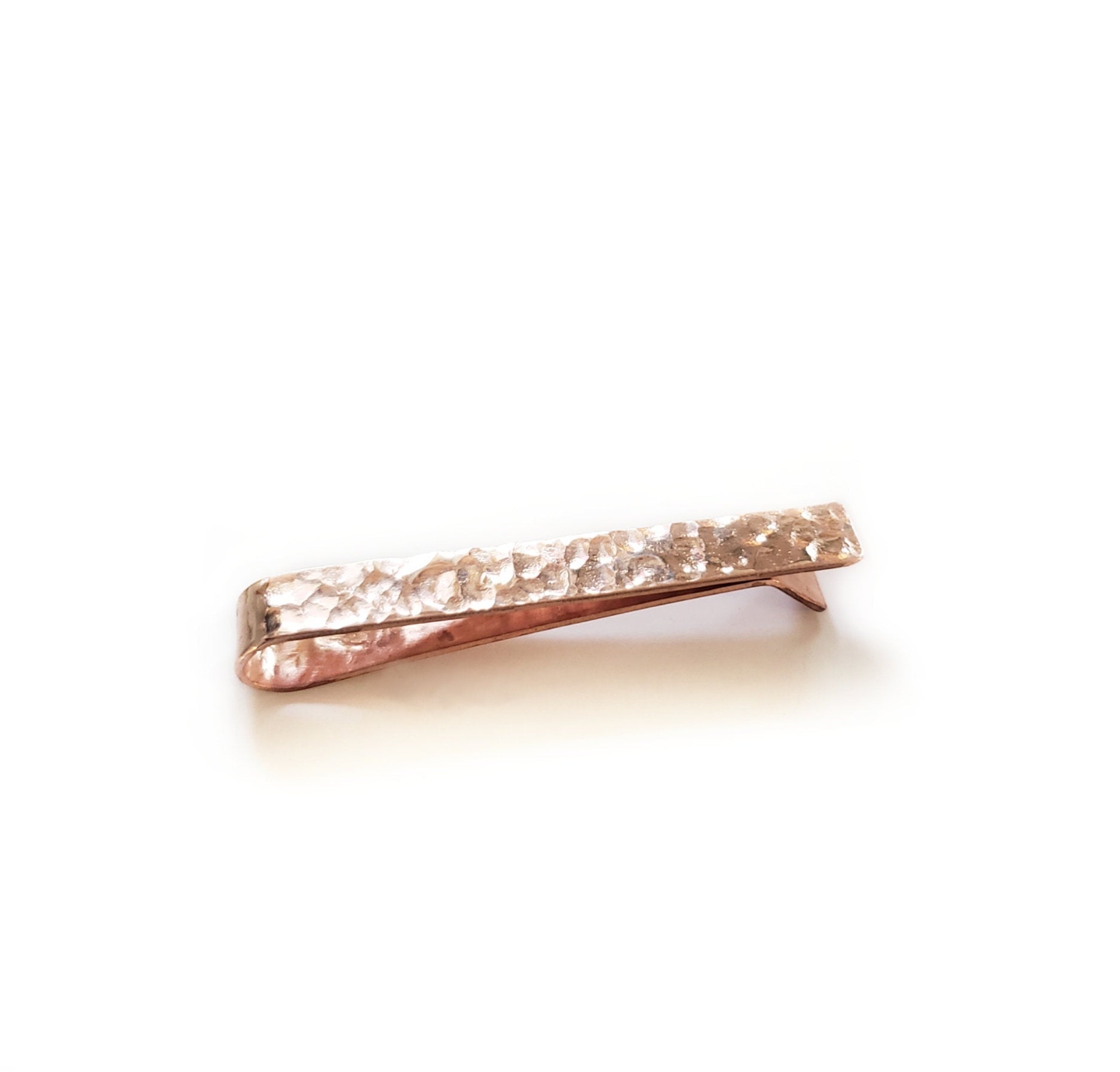 Copper tie bar given a dappled texture and then given an oxidized finished to add depth.