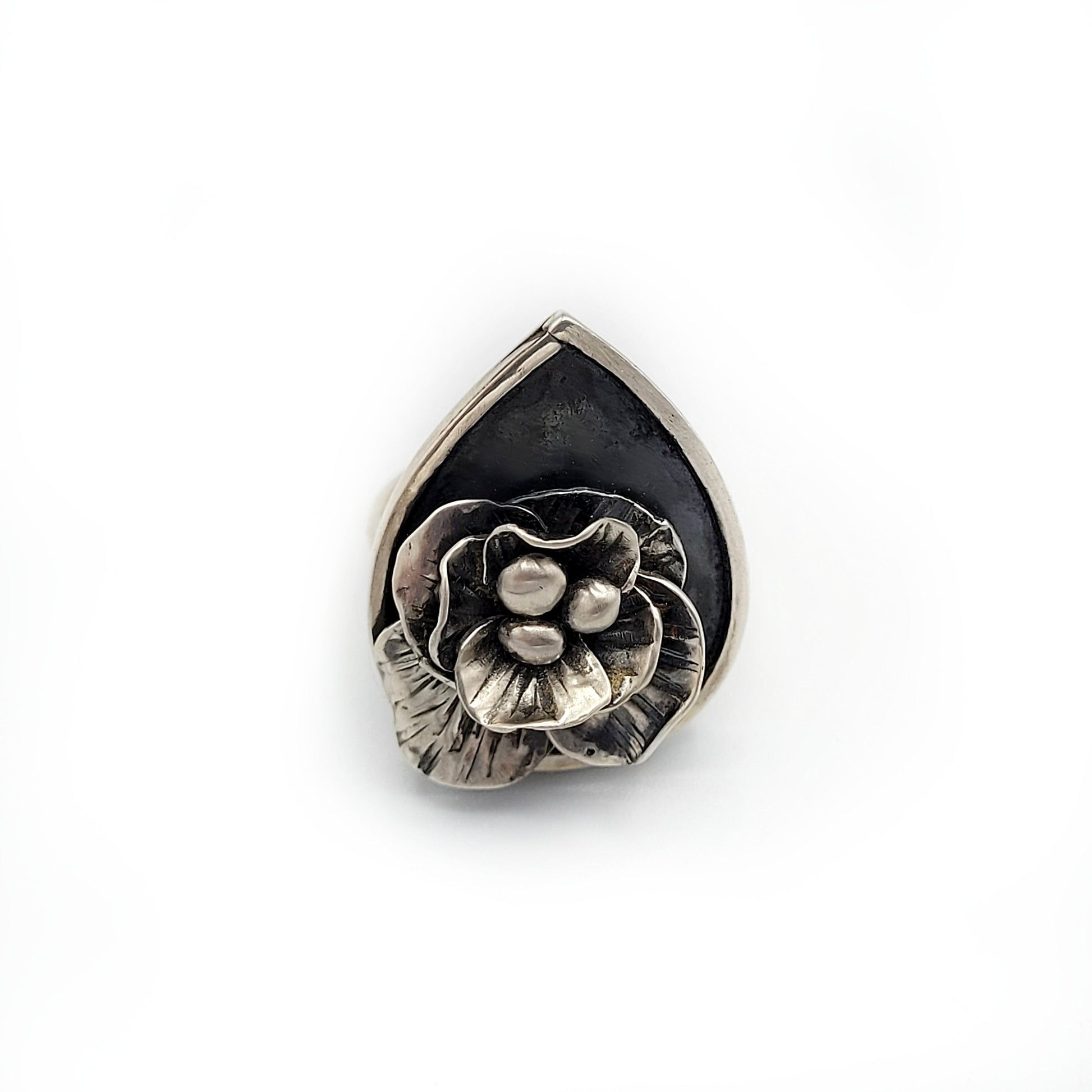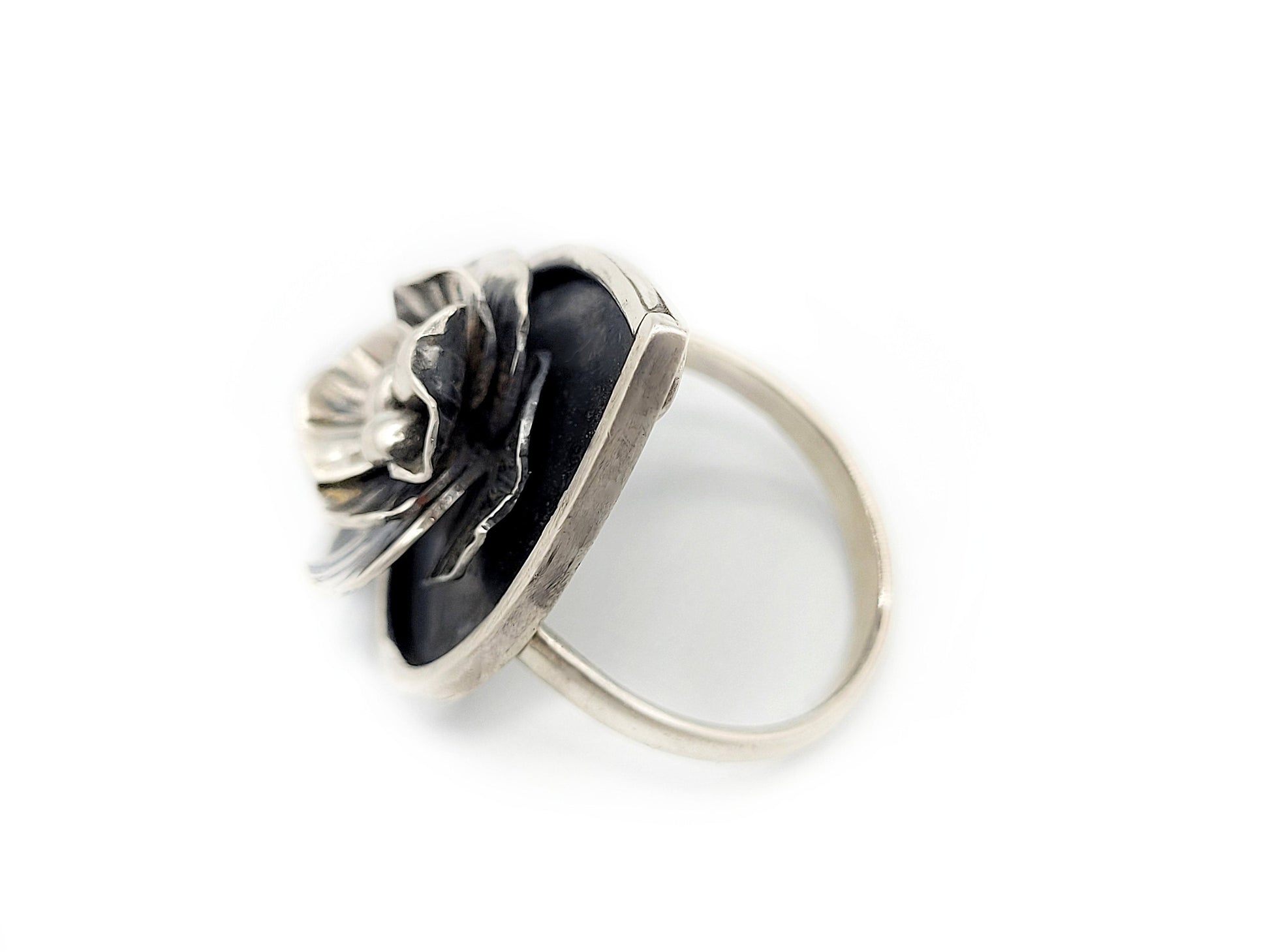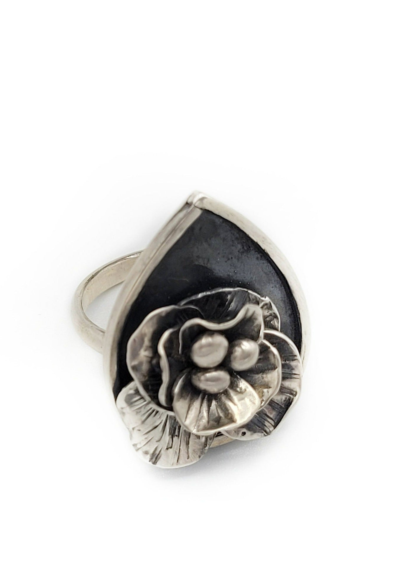 This ring is a little bigger than the average everyday ring and get's noticed and complimented on. Also not too big to be uncomfortable. I am an avid gardener and love everything about flowers! Growing them, smelling them, arranging them and giving them! I didn't have a specific flower in mind when I forged it, all I was going for is a pretty flower! I have a special affinity for poppies and peonies so I think it came out as a little bit of a cross between the two.