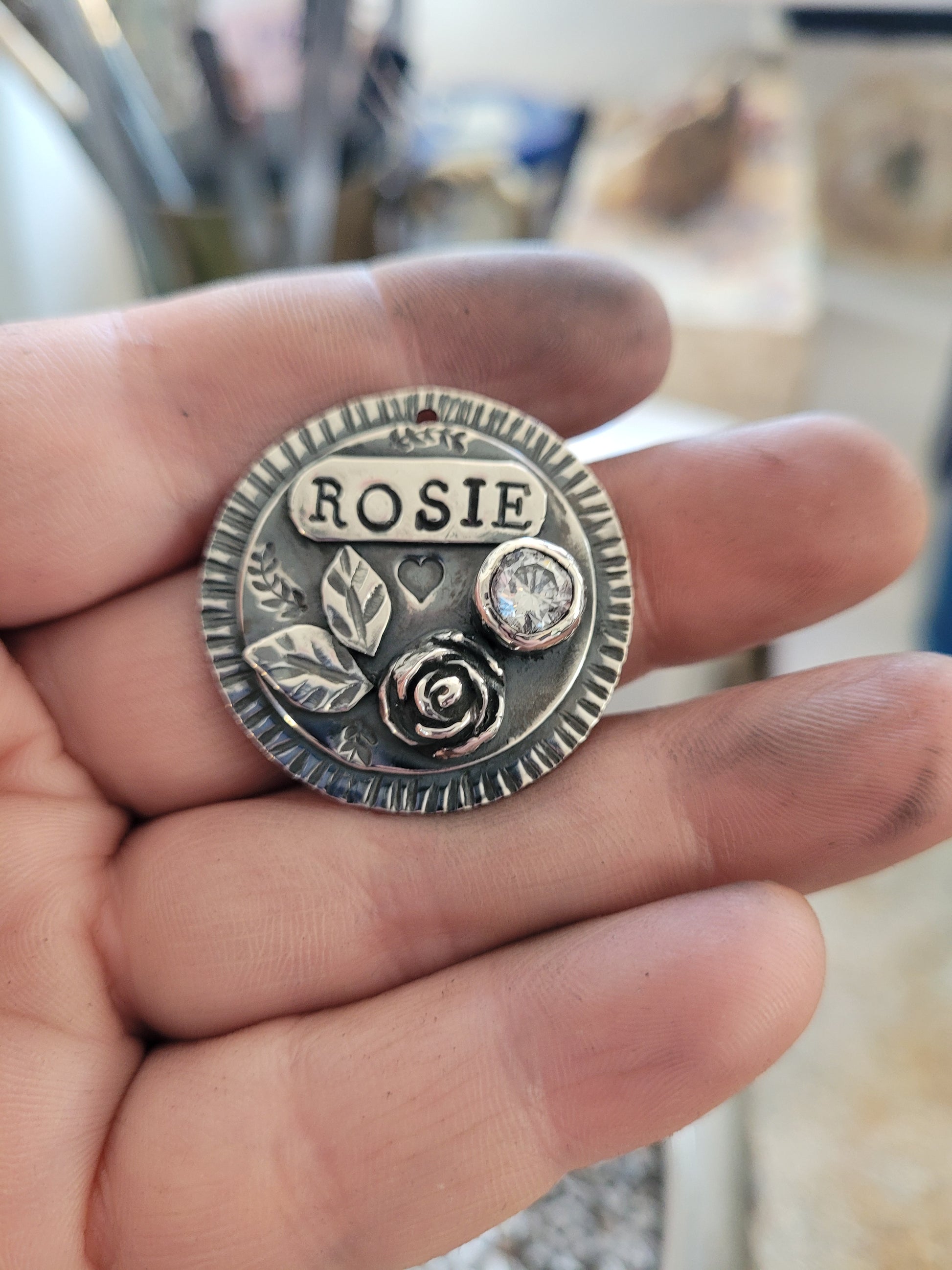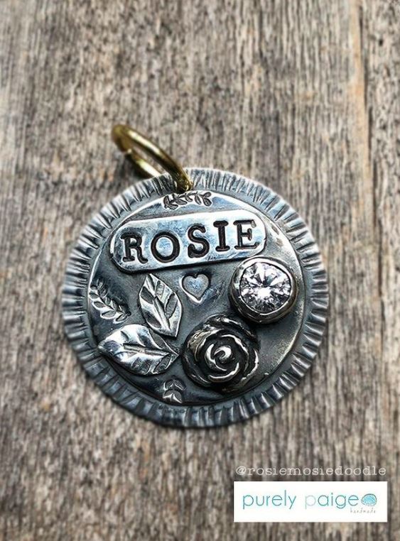 Spoil your sweet pet with this fancy sterling silver tag with a hand sculpted rose and sparkly cubic zirconia.