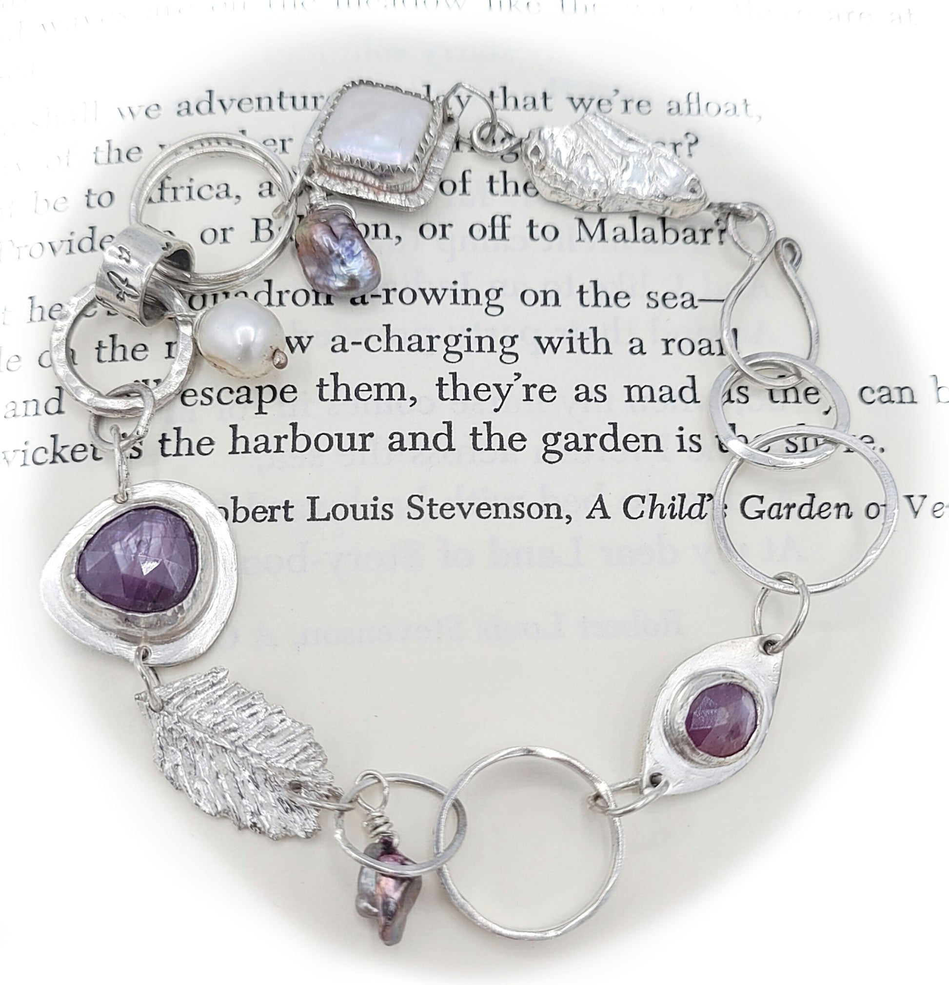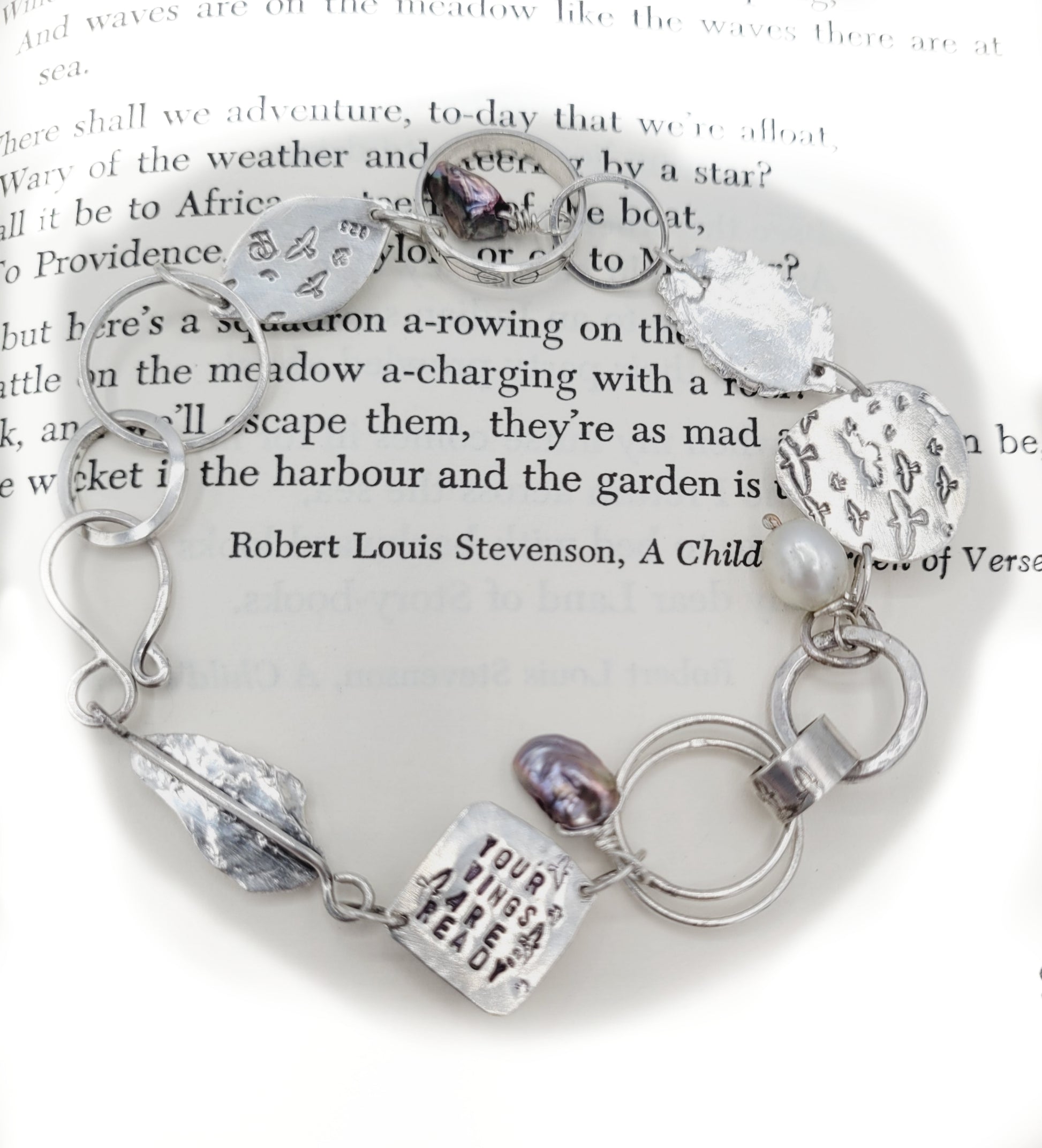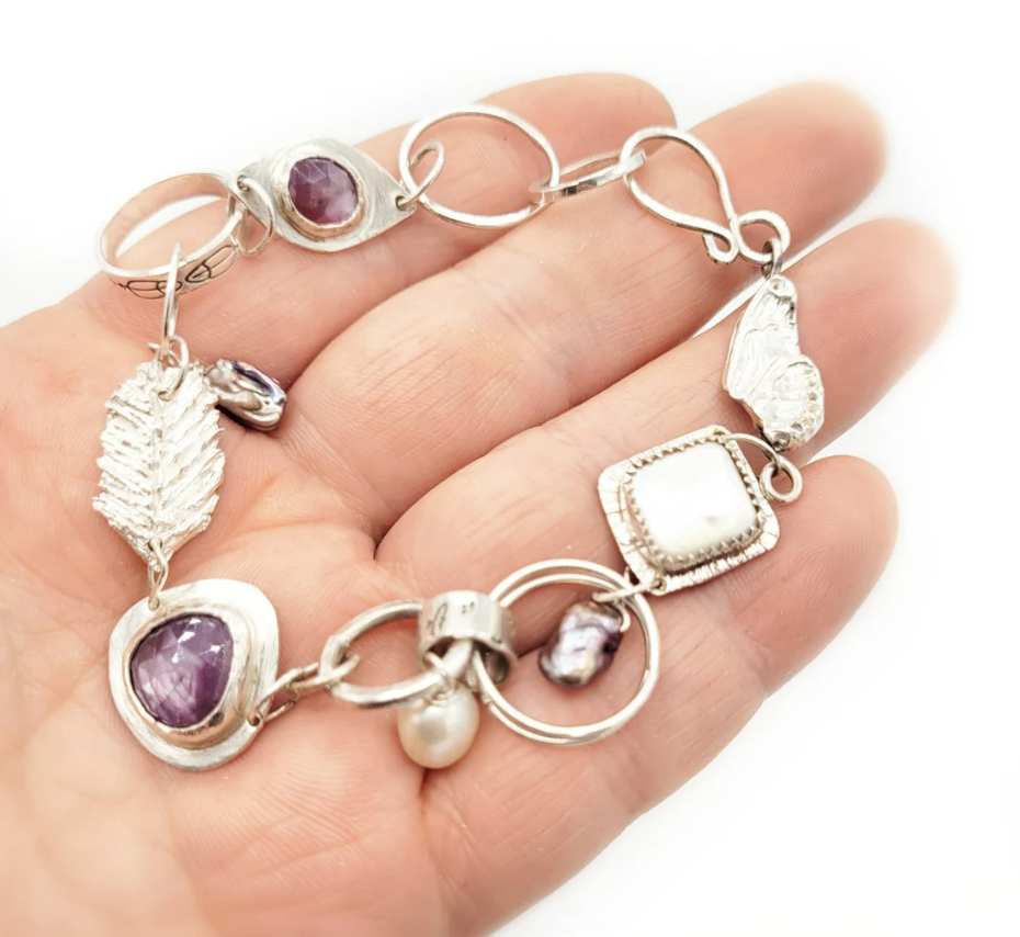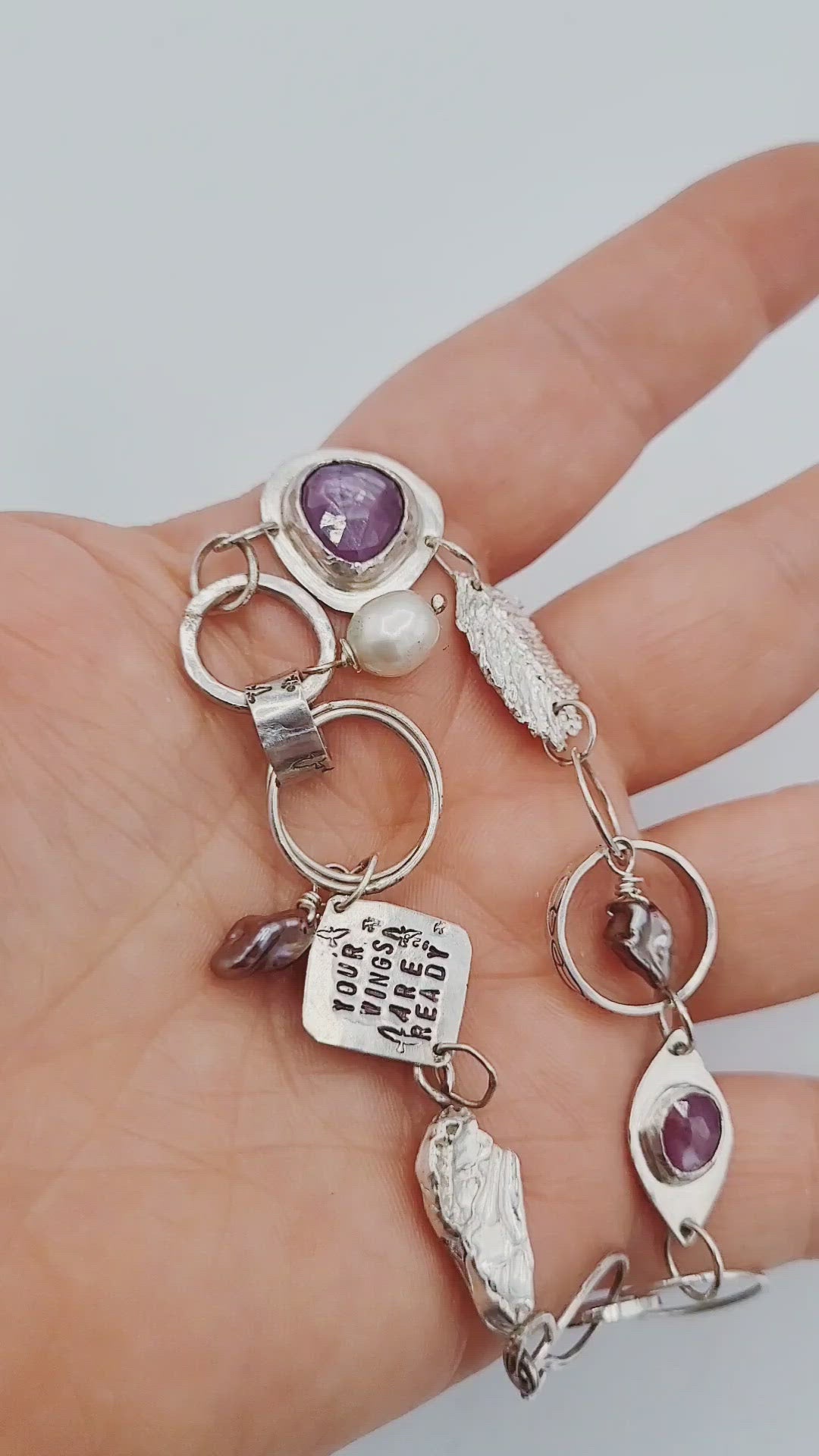 Hand sculpted fine silver feather, shimmery rose cut pink sapphires, freshwater and Keishi pearls, handstamped birds feathers and the quote, "Your Wings are Ready" held together with sterling silver hand formed links. This piece was made to inspire the wearer to take chances and go after their bliss.