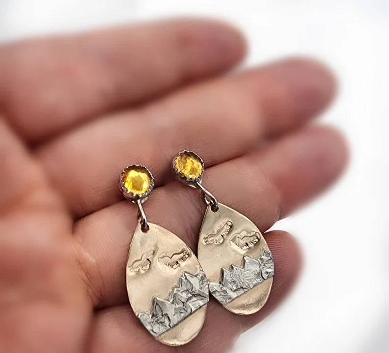 If you look close enough, you will be pulled into dreamy setting complete with 2 soaring birds a faceted citrine sun reflecting it's golden rays onto a lake nestled under beautiful textured sterling silver mountains.
