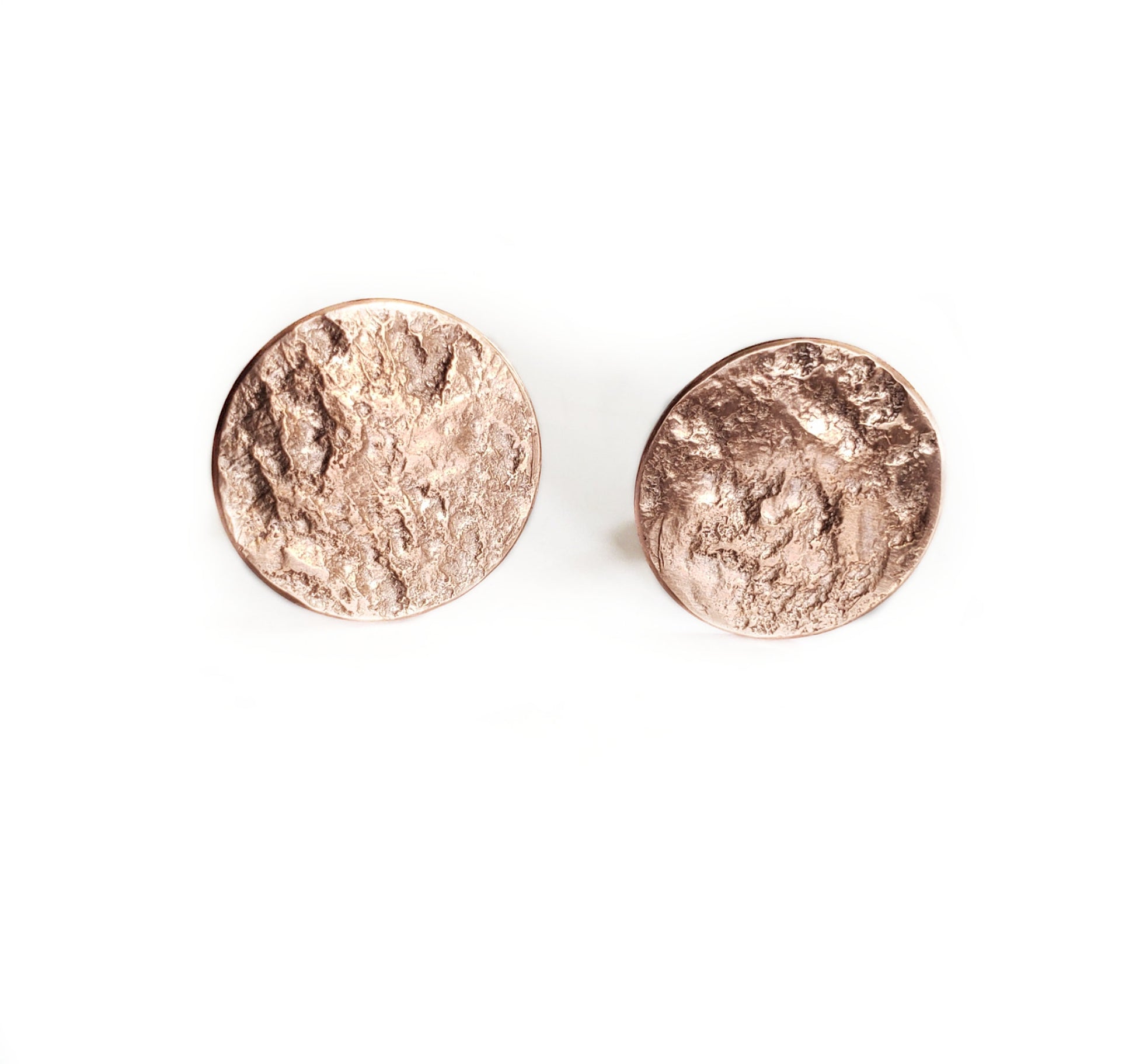 Textured copper made to look like two harvest moons to be worn as cuff links.
