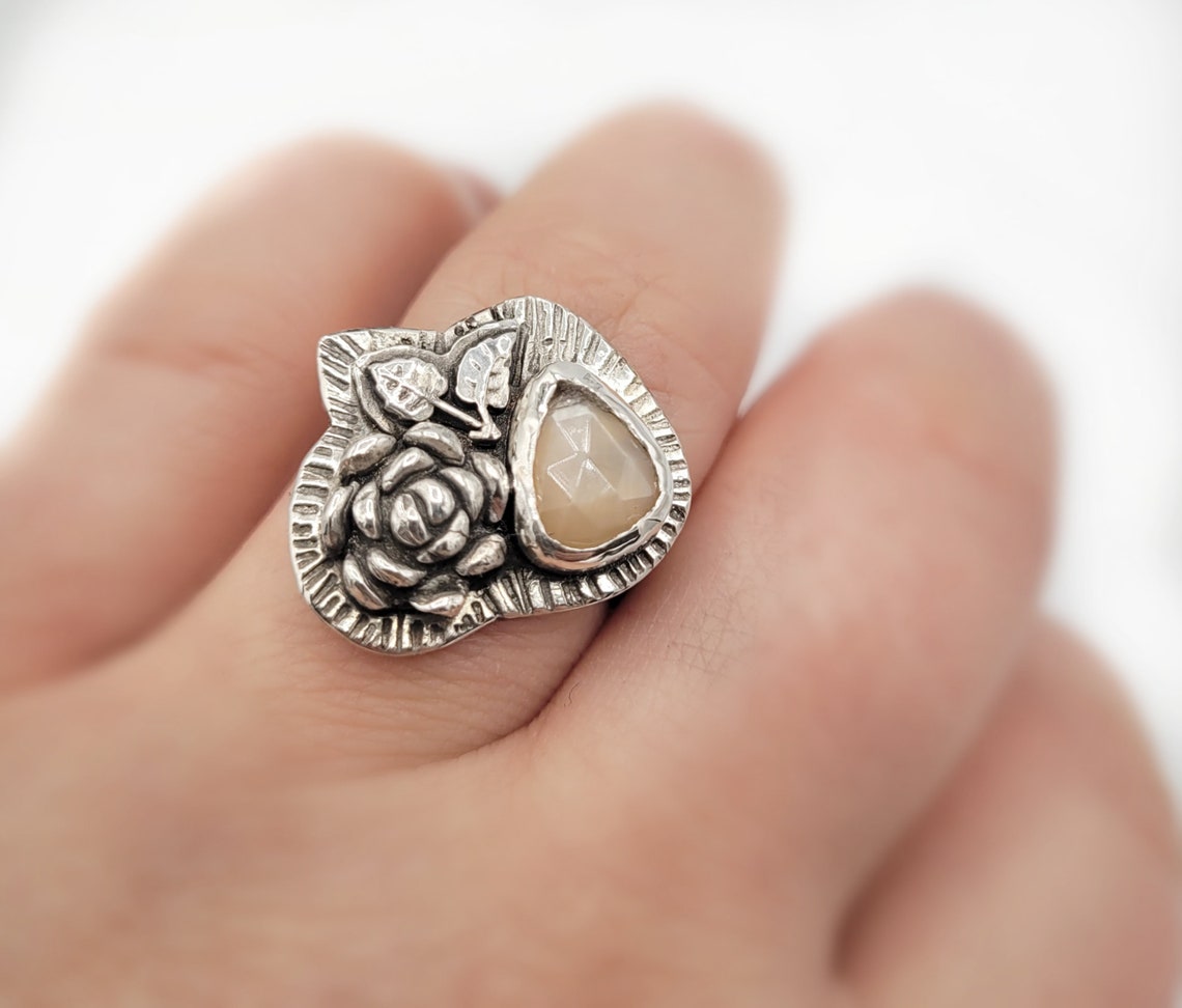 Beautiful shimmery peach moonstone is surrounded by a handsculpted flower and leaves in fine silver. The ring shank and hand textured back plate are sterling silver.