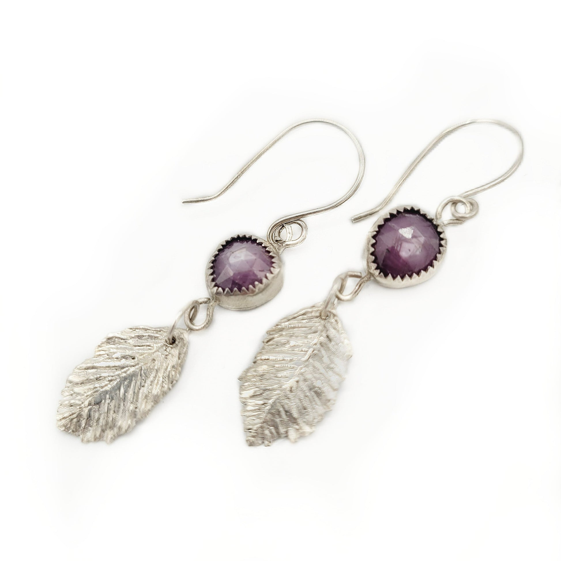 Sculpted Silver Feather Earrings - Pink Sapphires