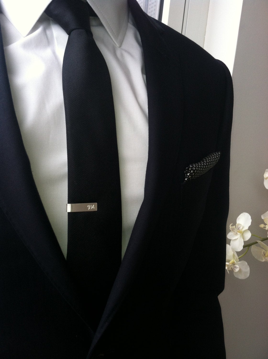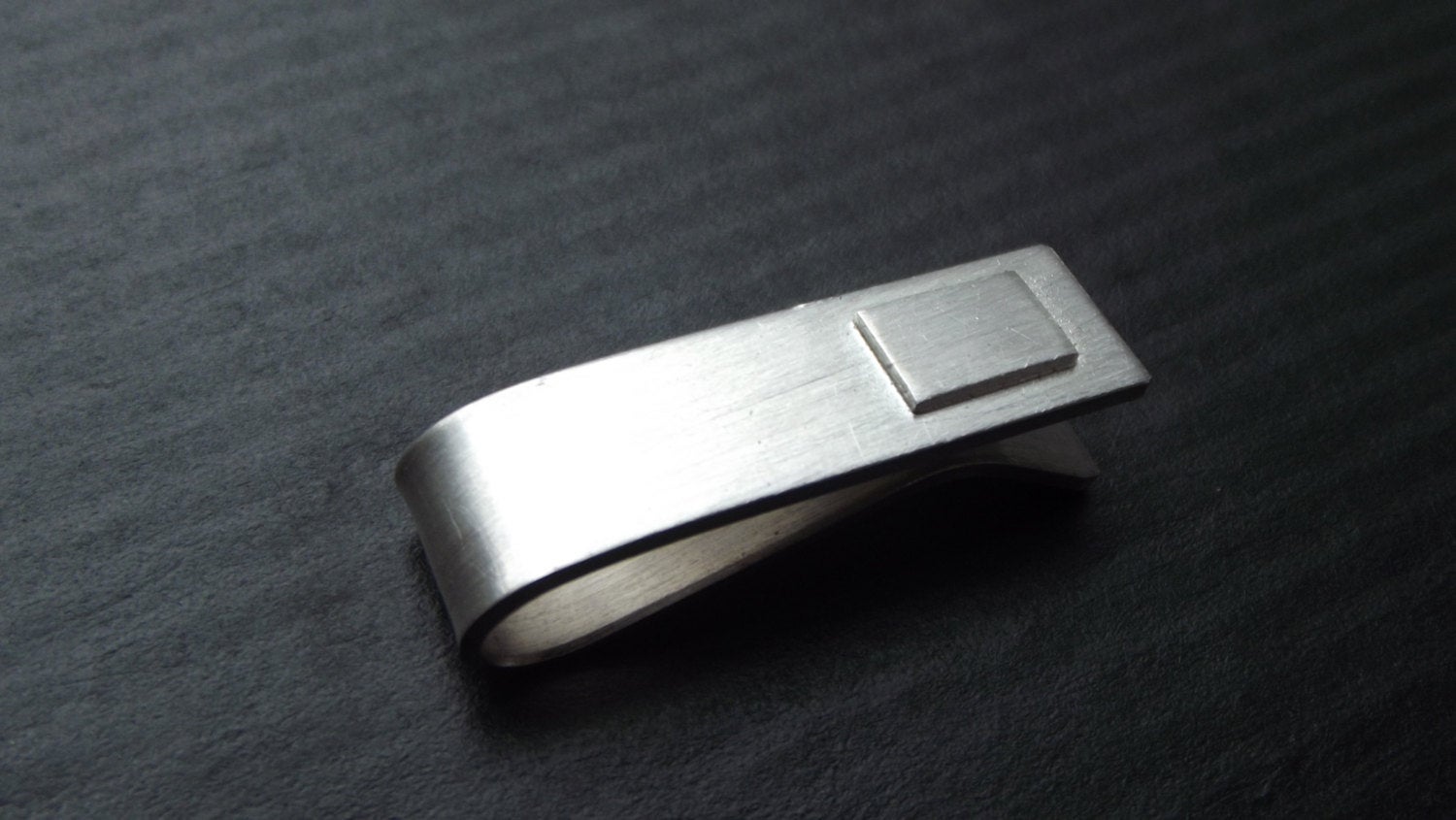 This tie bar looks best on a skinny tie and has been completely hand forged out of 20 gauge sterling silver which is a thicker and more durable gauge than my 24 gauge bars. I soldered a square layer of silver to add some modern style interest. The square can be inscribed with initials for only 5.00 more!