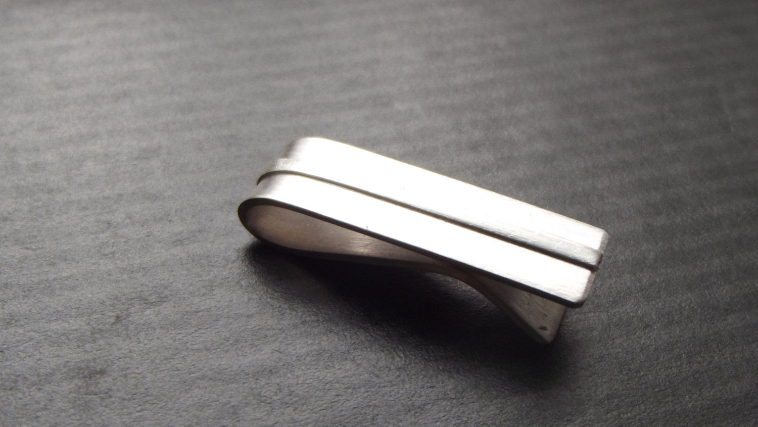 This tie bar looks best on a skinny tie and has been completely hand forged out of 20 gauge sterling silver which is a thicker and more durable gauge than my 24 gauge bars. I soldered a thin strip of silver from front to back of this bar to give it a classic but still unique feel. Also, the strip comes very had in getting a good grip on the piece to put it on and helps to keep it in place.