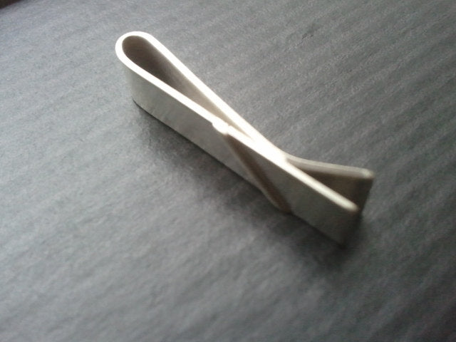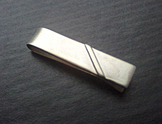 This tie bar looks best on a standard necktie and has been completely hand forged out of 20 gauge sterling silver which is a thicker and more durable gauge than my 24 gauge bars. I soldered a thin strip of silver diagonally towards the end of this clip to give it a cool retro feel.