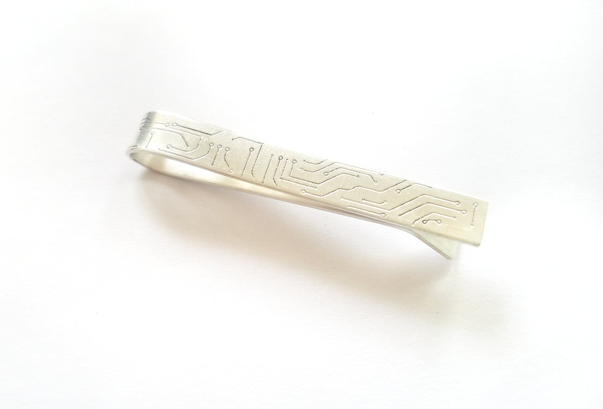 This tie bar has been hand forged out of sterling silver. I cut, shaped and added the circuit board engraving. I am really proud of the unique geeky dapper design of this one. You will get a lot of looks because at first glance the subtle lines look like just some nice texture but then look a little closer and it is obvious that the lines look just like a circuit board. Perfect for technology lovers of all kinds.