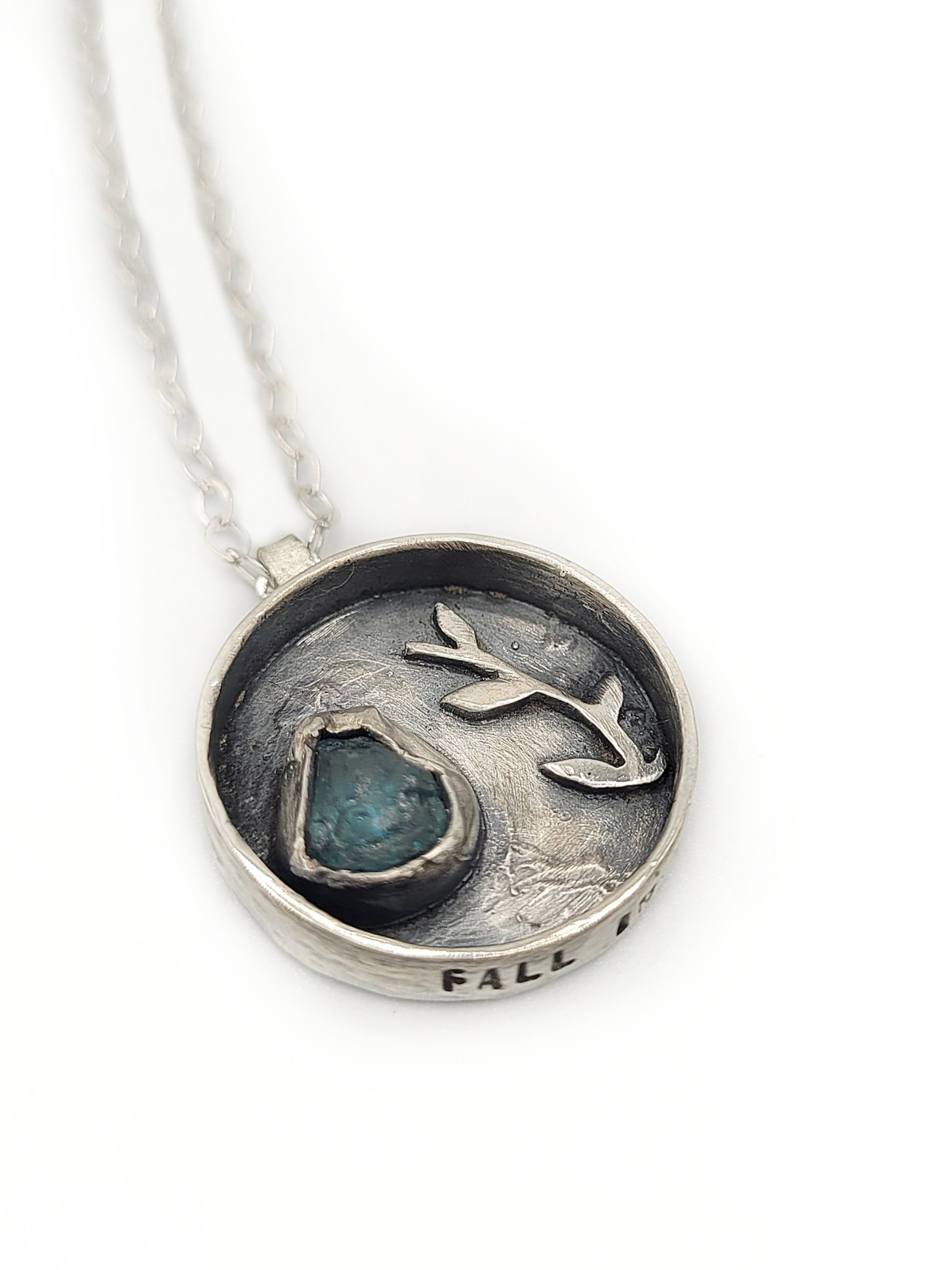 Beautiful blue rough Apatite is set inside a shadowbox pendant with 1 sweet vine and organic texture surrounds it. Handmade in my Seattle, WA studio.