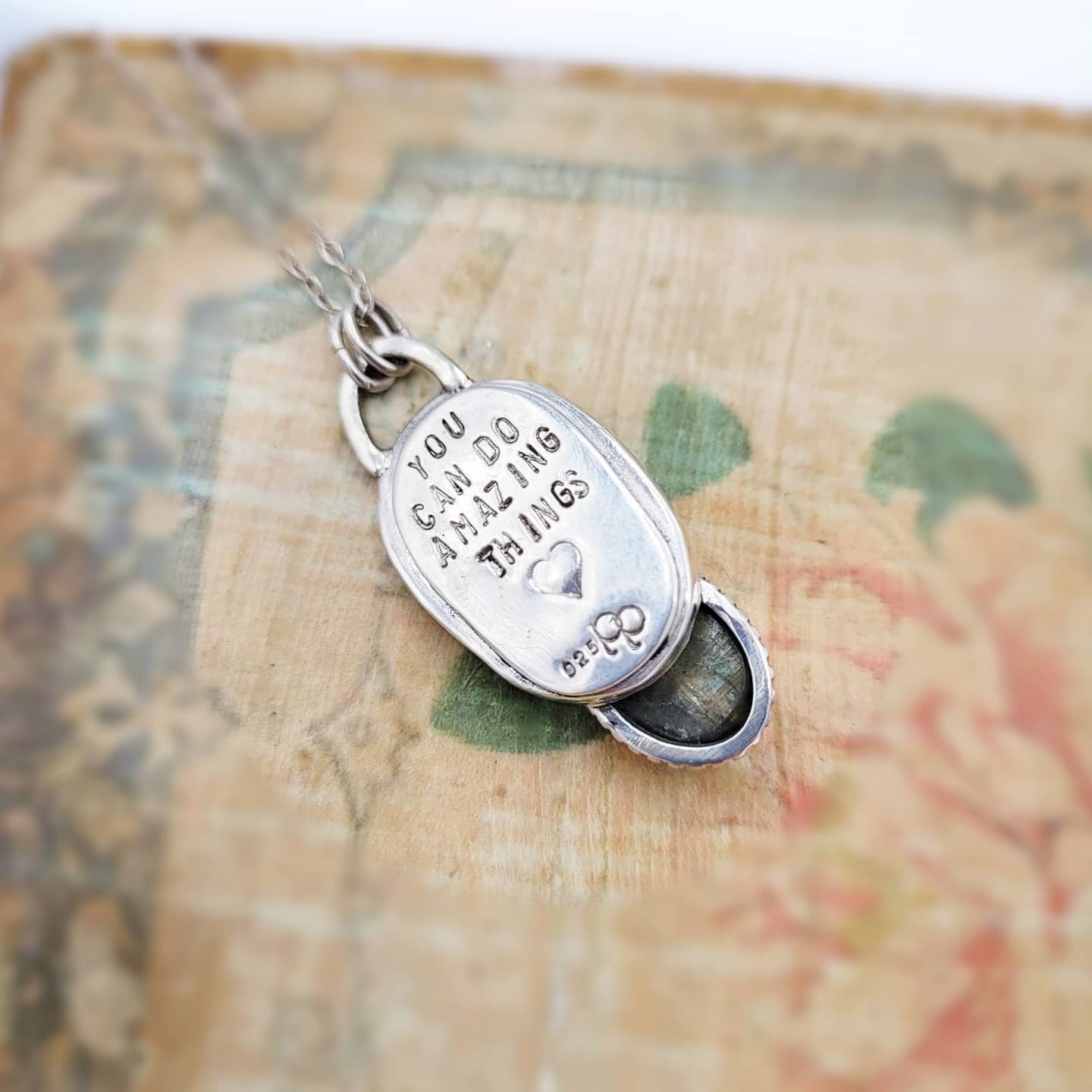 Handstamped on the back with the words, "You can do amazing things" and a signature heart to signify the love and care that went into this piece and will therefore be carried with the wearer.